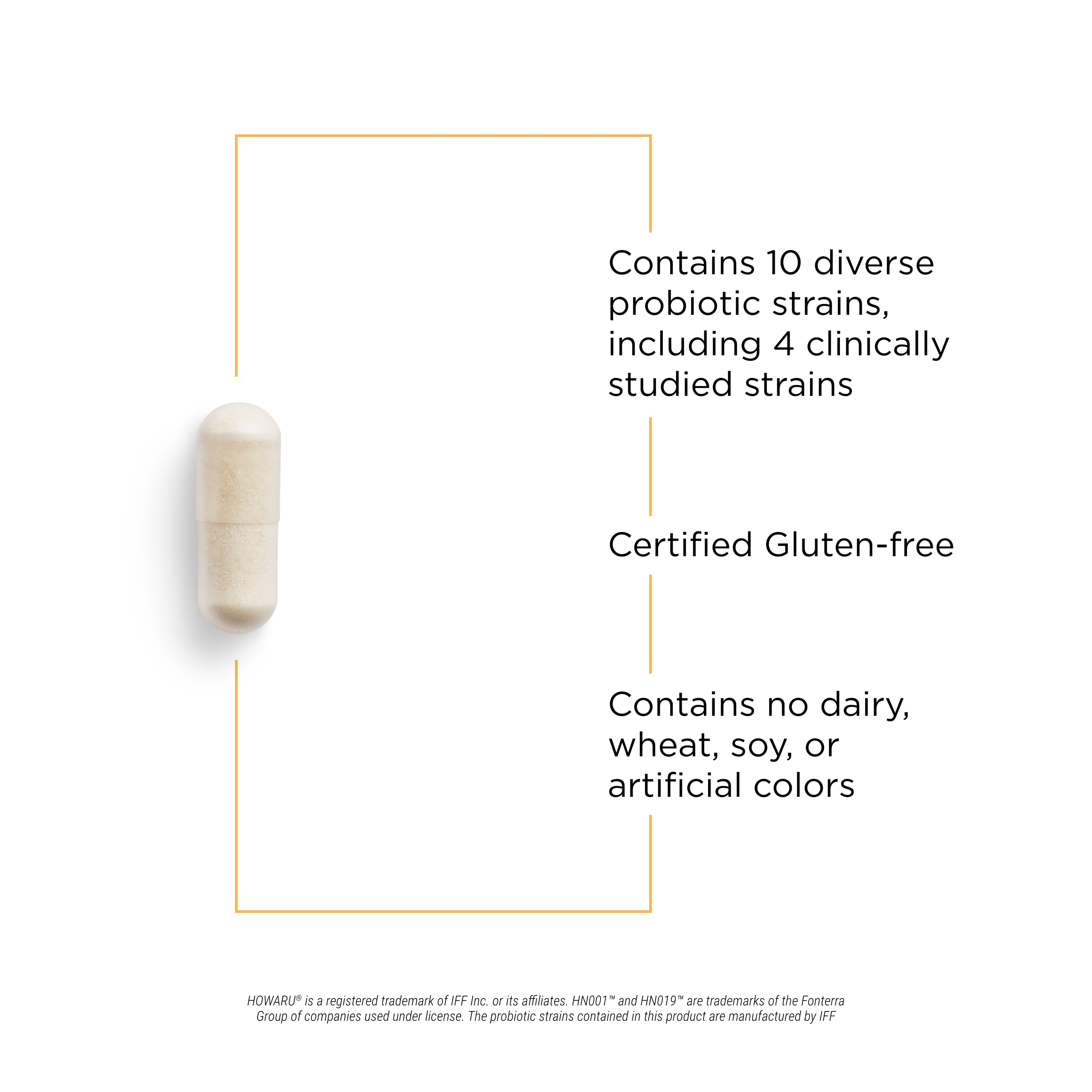 HOWARU® is a registered trademark of IFF and is used under license. HN019™ and HN001™ are trademarks of the Fonterra Group of companies used under license. The probiotic strains contained in this product are manufactured by IFF.